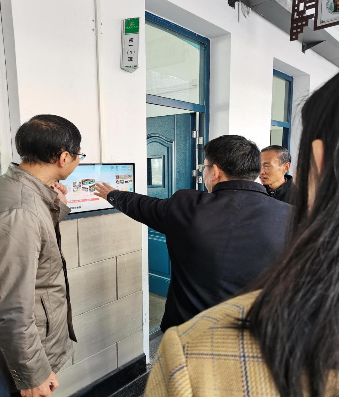 在市第二中学,吴财锋走进教室了解学生学习情况,查看了电子班牌的使用情况,对电子班牌的“学生活动展示”“家校联通”功能给予了充分肯定,对学校的劳动教育和禁止手机进校园的工作表示满意。