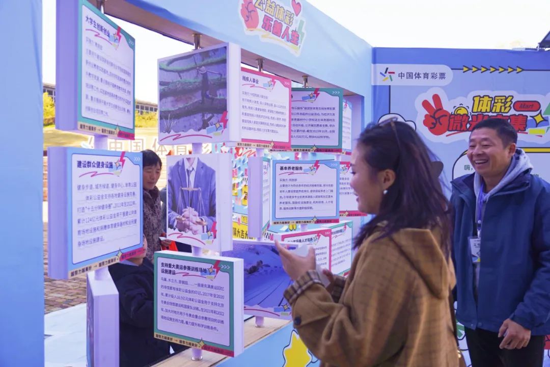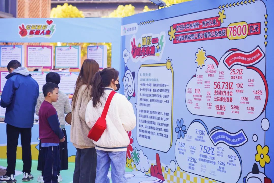 广场中央的互动区以体彩品牌公益项目展示为主,公益金知识问答、拍照打卡、体彩上上签许愿墙都是市集内的“人气担当”。来逛市集的市民朋友一边动手翻阅展牌上的公益行动介绍,一边在问答中了解关于体彩的有趣知识。