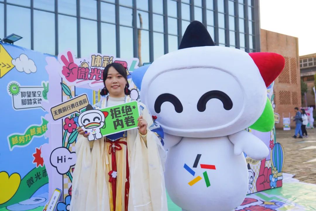 体彩拍照打卡区域的精美布置吸引了不少穿着汉服、特色服装的年轻群体,他们在打卡区挑选心仪的手举牌,摆出充满活力、富有朝气的姿势,拍照打卡、定格美好。