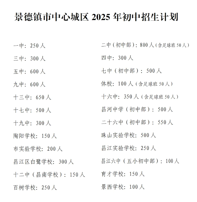 景德镇市中心城区初中招生计划共8450人,详见附件。同时,为贯彻落实《江西省青少年足球改革发展实施方案》,推动青少年足球高质量发展,从2025年秋季学期开始,在景德镇二中、十六中、体校初中部各新增一个50人足球特长班。对于未被足球班录取的学生,可依据户籍或房产进行志愿填报。三年后将从足球特长班学生中遴选50人进入二中高中部足球班。具体考核录取办法另行通知。