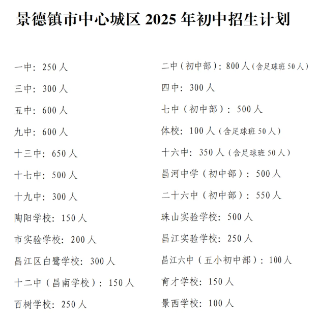 景德镇市中心城区初中招生计划共8450人,详见附件。同时,为贯彻落实《江西省青少年足球改革发展实施方案》,推动青少年足球高质量发展,从2025年秋季学期开始,在景德镇二中、十六中、体校初中部各新增一个50人足球特长班。对于未被足球班录取的学生,可依据户籍或房产进行志愿填报。三年后将从足球特长班学生中遴选50人进入二中高中部足球班。具体考核录取办法另行通知。