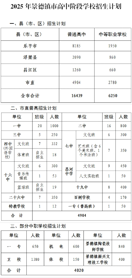 2025年我市高中阶段学校招生计划分别为:普通高中16439人(含综合高中普高班160人),中等职业学校6250人。根据年度目标管理和中小学办学条件,对高中阶段学校招生计划进行了分解,分解后的招生计划见附件。