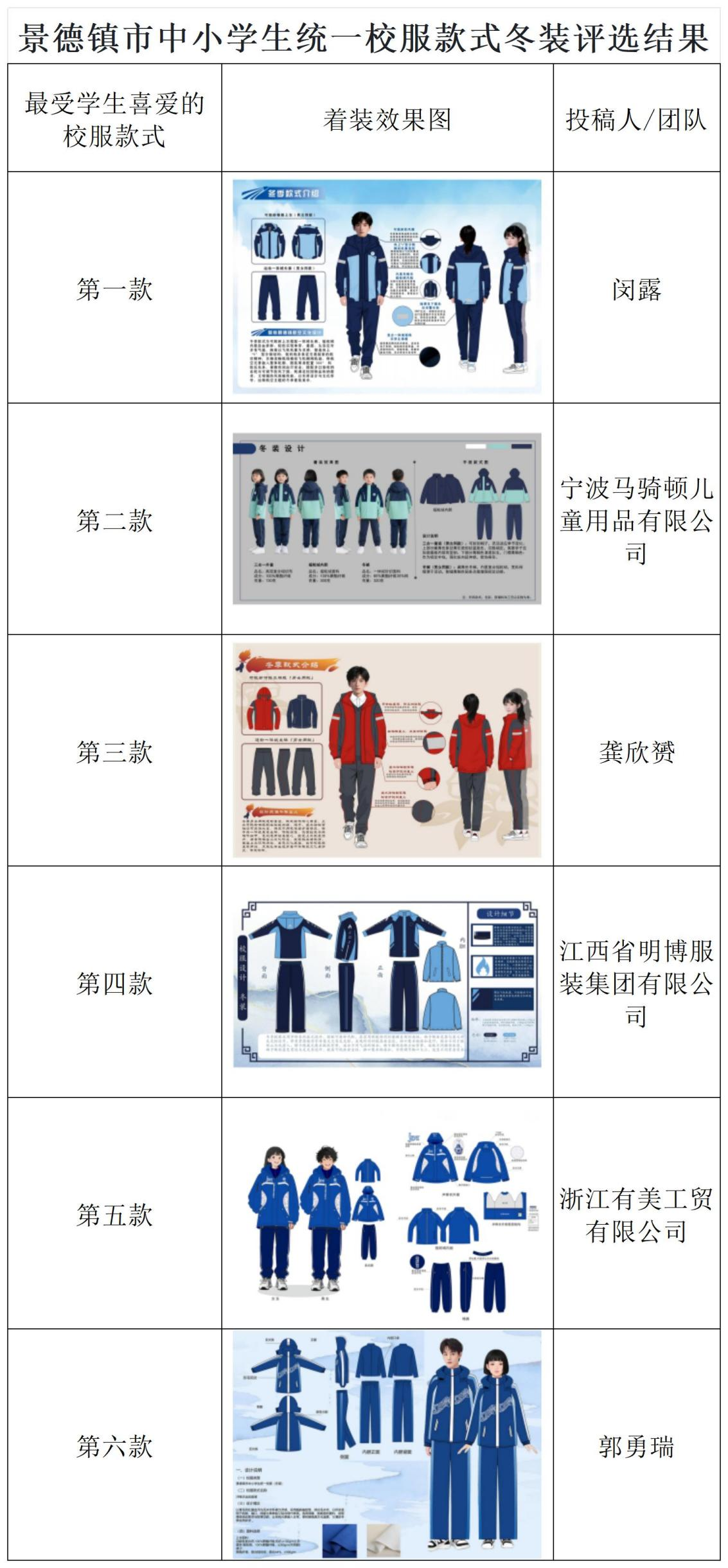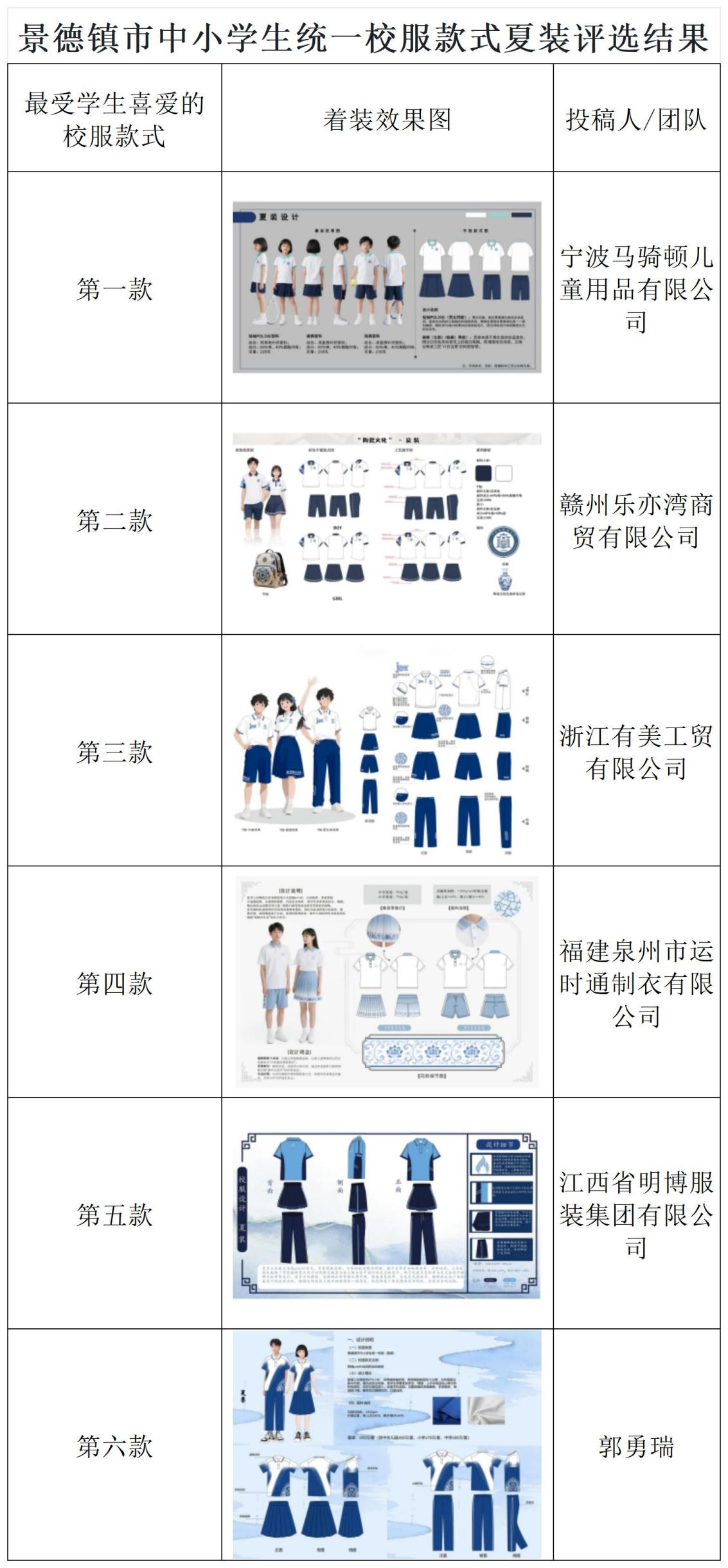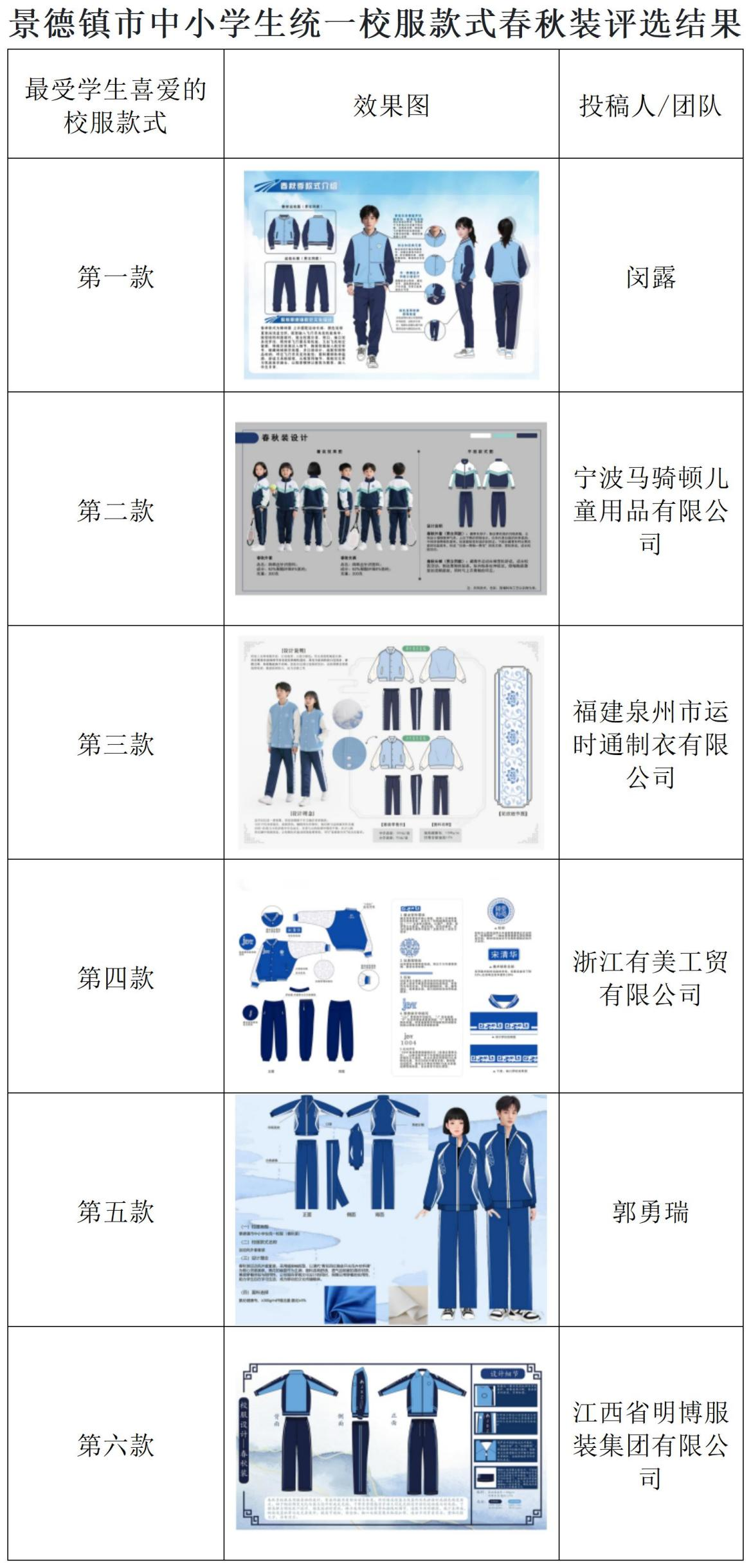 为提升景德镇市中小学生(含幼儿园幼儿)校服规范化、特色化水平,增强学生集体荣誉感和文化认同感,根据《景德镇市推进落实中小学生校服“一市一款”工作实施方案》部署,现就我市中小学生统一校服款式评选结果予以公示。