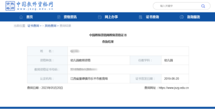 (1)所有参加资格审查人员(除今年参加教师资格认定人员)须到“中国教师资格网——证书验证”栏(网址:https://www.jszg.edu.cn/validationList.html),进行证书验证,并打印好“验证后的教师资格查询结果(样式如下)”备查;