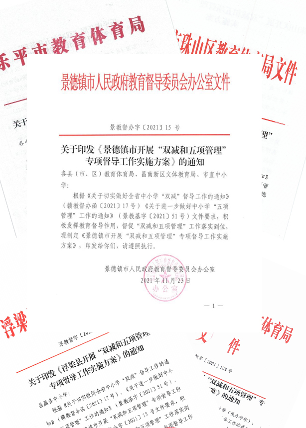 为更好地贯彻落实中共中央办公厅、国务院办公厅《关于进一步减轻义务教育阶段学生作业负担和校外培训负担的意见》精神,根据《关于切实做好全省中小学“双减”督导工作的通知》(赣教督办函〔2021〕17号)《关于进一步做好中小学“五项管理”工作的通知》(景教基字〔2021〕51号)文件要求,积极发挥教育督导作用,督促“双减和五项管理”工作落实到位,景德镇市于12月份在全市开展双减和五项管理专项督导。