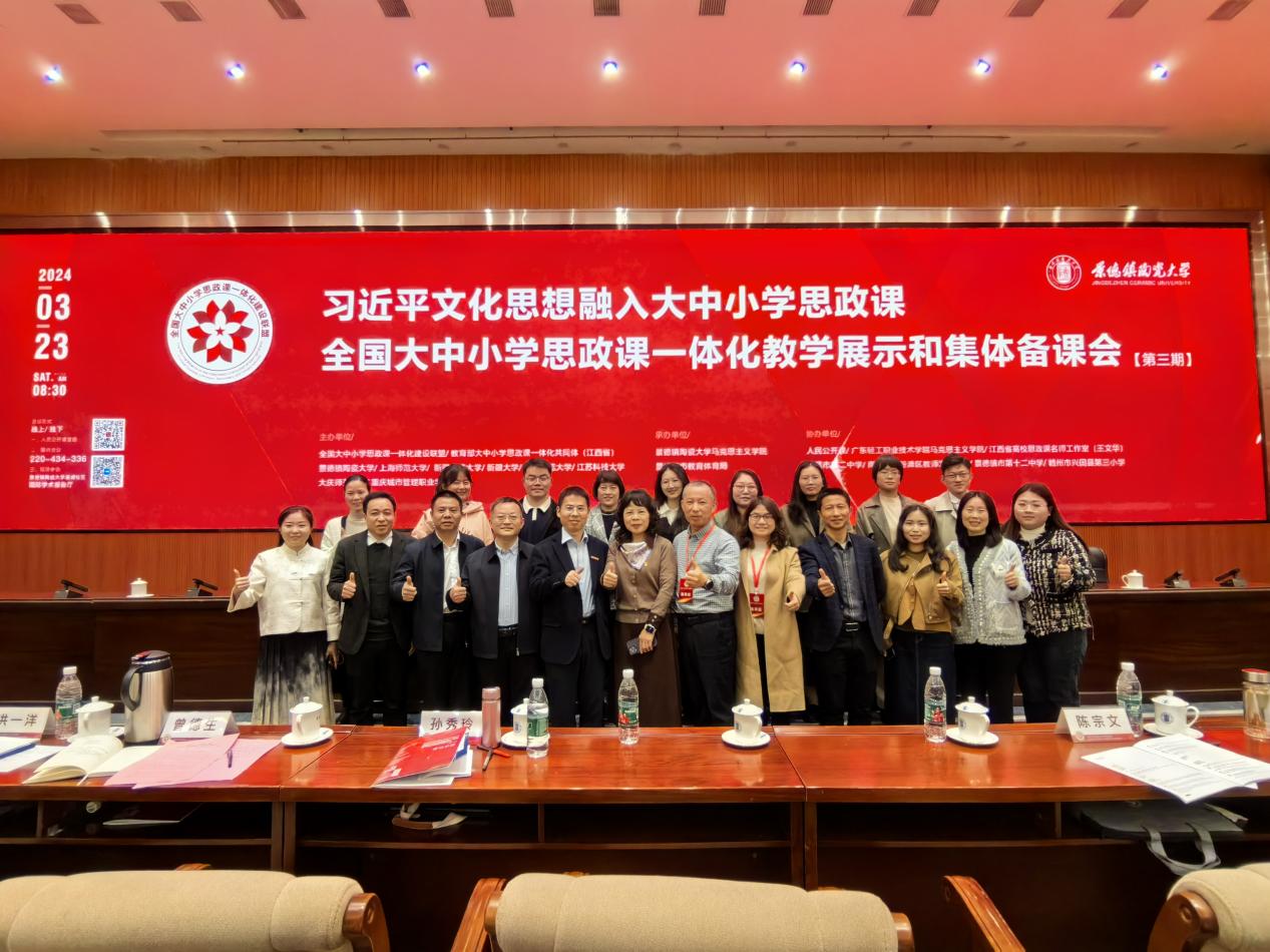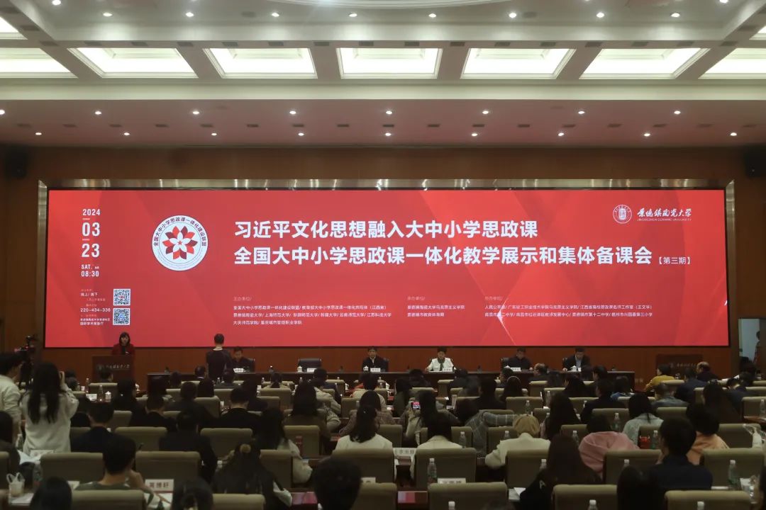 为隆重纪念习近平总书记“3.18”讲话五周年,学习贯彻习近平总书记的重要讲话精神,2024年3月23日,全国大中小学思政课一体化建设联盟教学展示和集体备课会(第三期)如期在景德镇陶瓷大学湘湖校区国际学术报告厅以线上与线下相结合的方式举行。会议邀请了江西省政协常委、教科文卫体委员会主任、江西省教育厅原厅长郭杰忠以及来自全国29个省(市、区)的82家成员单位的大中小学思政课教师代表和部分高校马克思主义学院在读研究生等13000余人参加线上线下学习交流。会议由景德镇陶瓷大学党委委员、副校长胡银娇主持。本次大会安排了专家导学、本硕博大中小不同学段的11位一线教师教学展示和专家点评,围绕习近平文化思想融入大中小学思政课为主题展开主题教学展示和集体备课活动。本次活动形式丰富多彩、内容针对性强,与会人员纷纷翘指称赞。