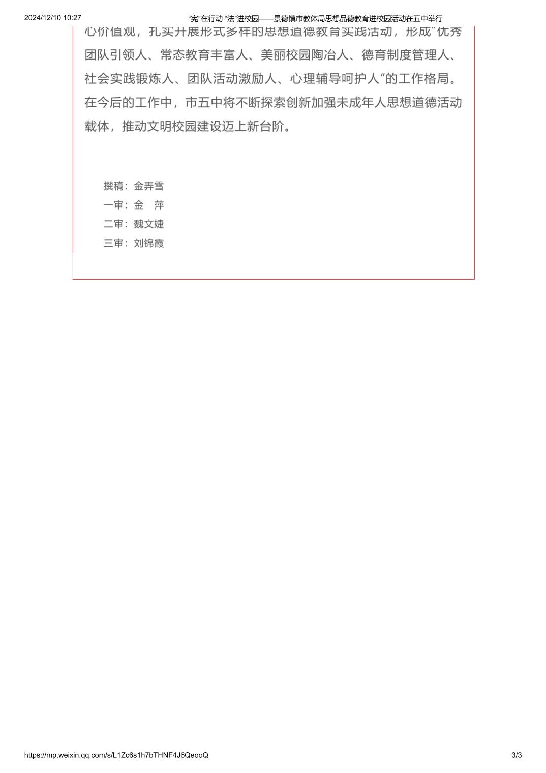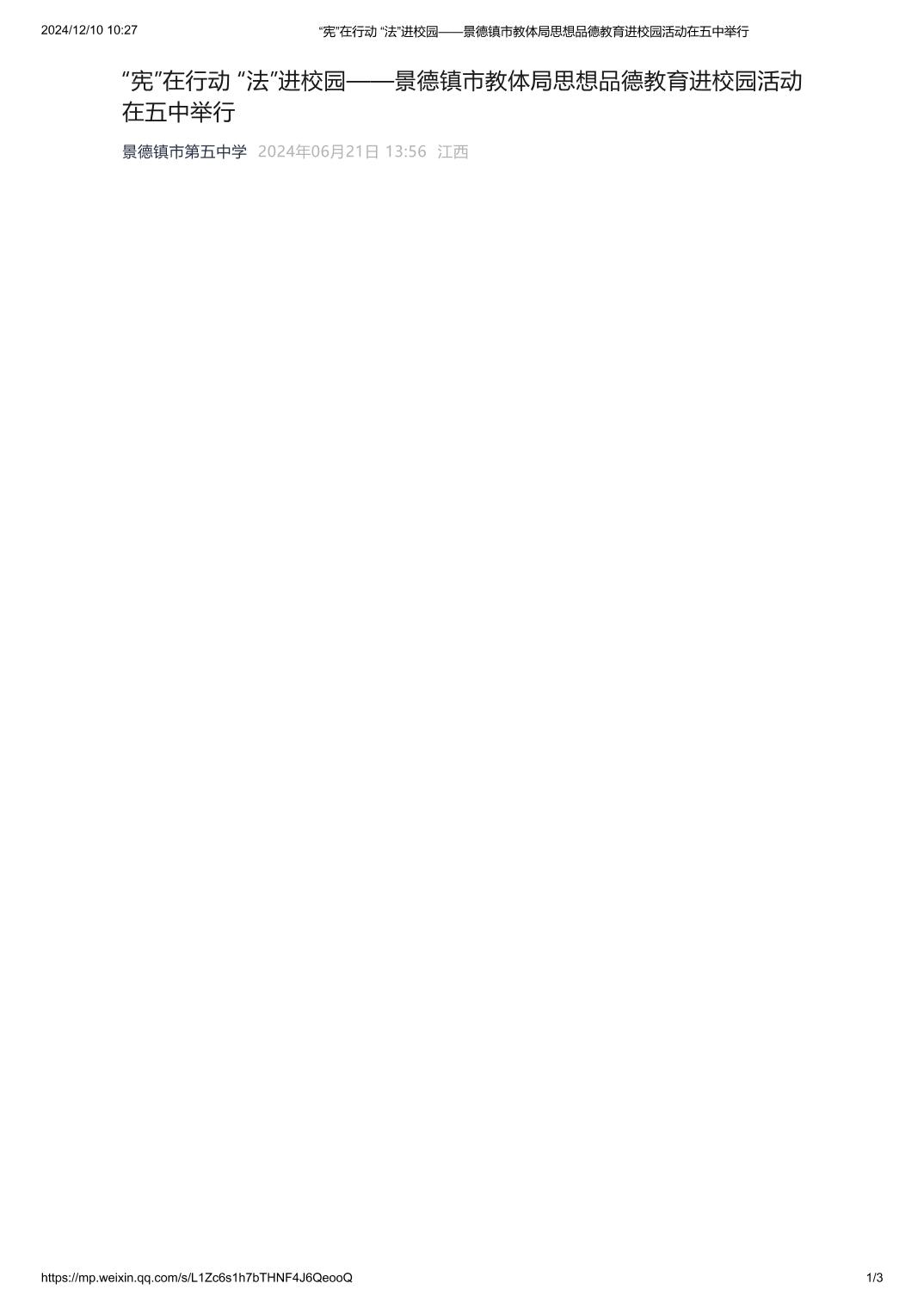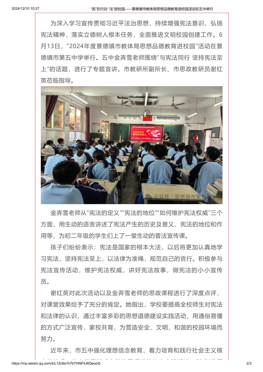 “宪”在行动 “法”进校园——景德镇市教体局思想品德教育进校园活动在五中举行