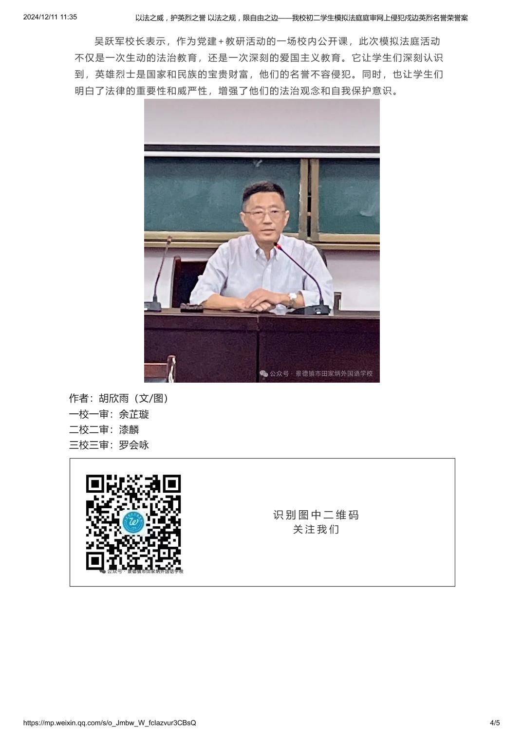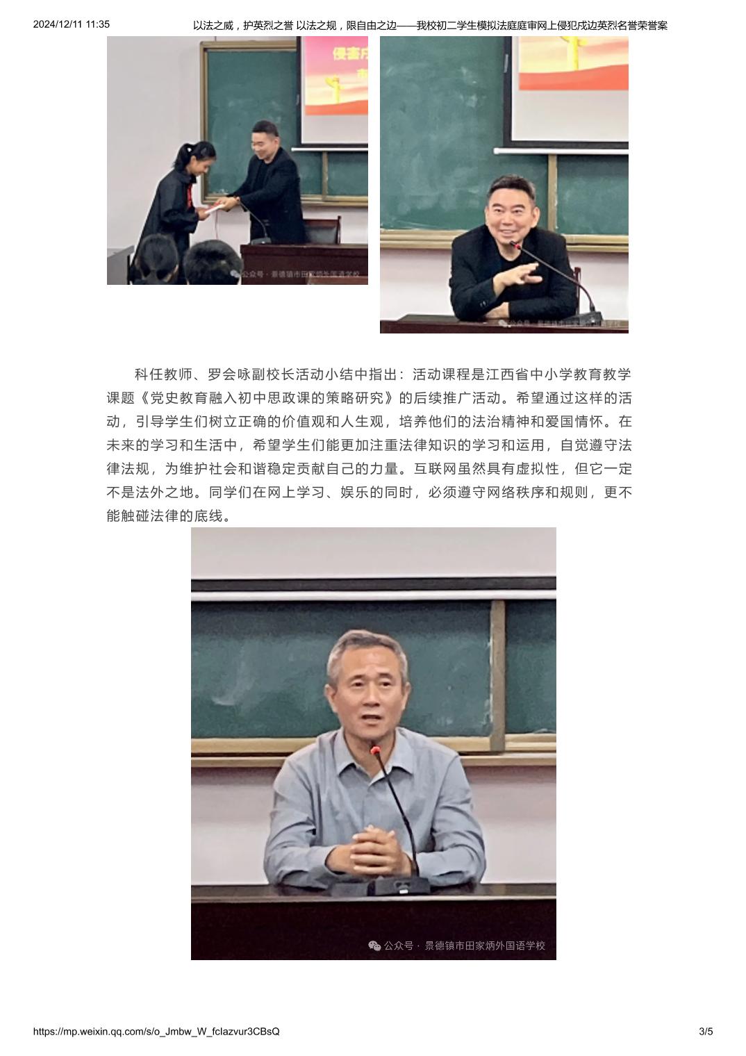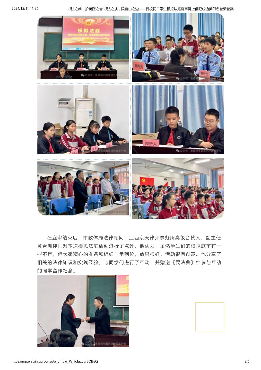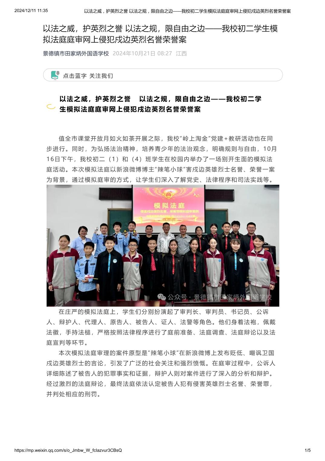 以法之威,护英烈之誉 以法之规,限自由之边——田家炳外国语学校模拟法庭庭审网上侵犯戍边英烈名誉荣誉案